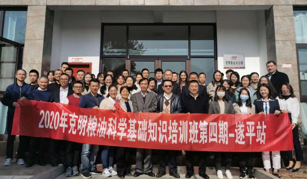 11月8日,2020年“yL23411永利官网登录-克明面业粮油科学基础培训班”第四期在遂平基地开班。克明面业有限公司(以下简称克明面业)总经理陈宏率公司管理层成员、技术骨干五十余人参加了全天的培训课程,我校包装工程系张国全教授、唐善华教授、王北海副教授、路婉秋博士四人主讲本次培训的四个专题。