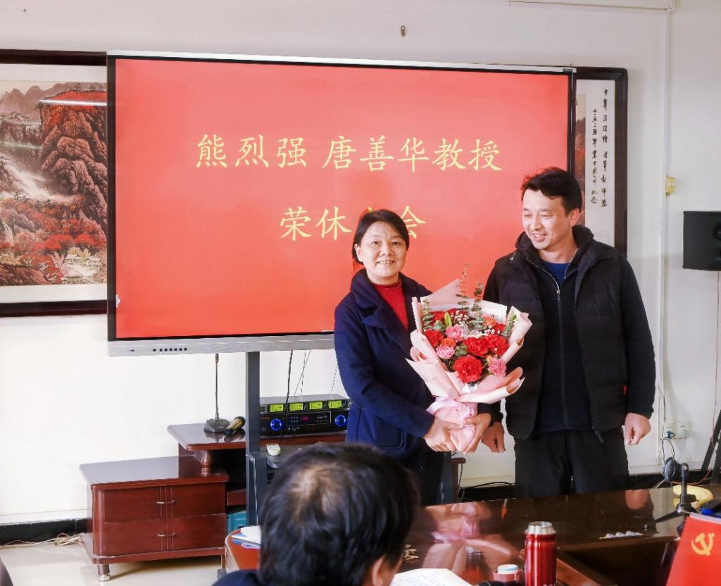 老师代表为熊烈强、唐善华两位教师送上鲜花,感谢他们对学校和机械学院的无私付出。