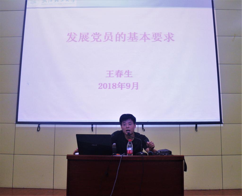 王春生老师从青年学生为什么要入党、加入党组织的条件、入党的程序、党员的义务、党员的权利、如何保持党的先进性六个方面进行宣讲。他首先带领大家详细梳理了中国共产党成立和发展的历史,回顾了党带领人民在革命、建设、改革各个时期取得的辉煌成就,使同学们对党有了更加全面的认识。然后他具体介绍了入党的流程,强调了学生党员发展的严肃性和精准化。他还从党员权利、义务以及党内生活的组织性和与群众的密切联系出发,对新生们提出殷切期望,希望大家能够牢固树立正确的人生观与价值观,认真学习,让勤奋学习成为青春远航的动力,让增长本领成为青春搏击的能量;用党员的标准严格要求自己,在同学中起到模范带头作用,积极向党组织靠拢;在正式加入党组织后继续发挥先锋模范作用,发扬党员的服务与奉献精神,以高标准和严要求规划自己珍贵的青春时光,争当青年党员中的时代先锋。