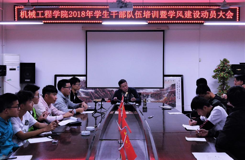 为帮助学院、行政班级学生干部进一步履行好职责,使我院学风建设再上新台阶,于11月1日下午学院党委刘凡副书记在机械楼526召开2018年学生干部队伍培训暨学风建设动员大会,对学生干部队伍进行培训和再动员,学院全体学生干部参加此次会议。