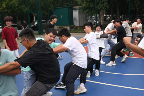 天气仍有丝丝热意,但前来助威加油的人并不少,赛场氛围热闹非凡。比赛前,双方队员扎稳马步,紧握绳子,只待一声哨响就齐心协力向后拉。场边同学们尽自己最大的声音为自己班级加油呐喊,“一二一二”整齐的口号声带着青春的回响响彻整个篮球场。